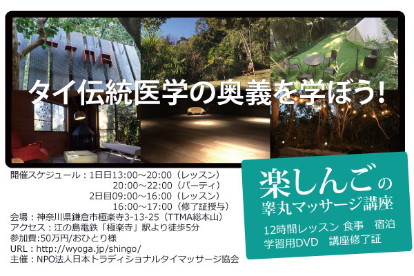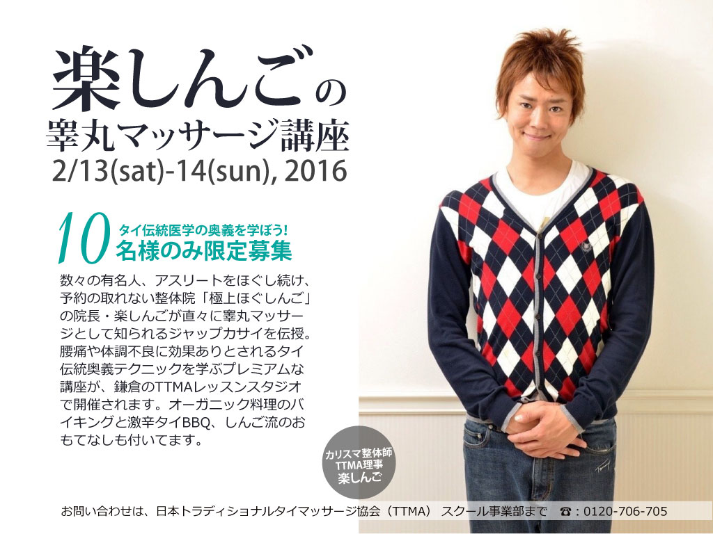 ◆この機会に伝説のテクニックをマスターしてください。 今回、TTMAの渡邊ソウイチロウと楽しんごがタッグを組んで実現した睾丸マッサージ講座は、かなり貴重なものです。タイ本国でもスクールとして教えてくれるところはありません。学ぶなら、数年間弟子入りしてやっと教えてもらえるかどうかという話です。アジアが生んだこの画期的な施術法は、プロのセラピストをも黙らせるほど、すごいテクニック。睾丸を引っ張って、そこにつながる精管という部位にテンションをかけながら施術します。かなり微妙なテンション具合が重要なポイントですが、1泊2日の12時間レッスンで徹底的に指導させていただきます。よくある質問は、「クライアントはエロい気持ちにならないですか?」というもの。お答えします。「伝統治療ですから、痛いです。仮にそんな感じになったとしても、あっという間にしぼんでしまいます。」